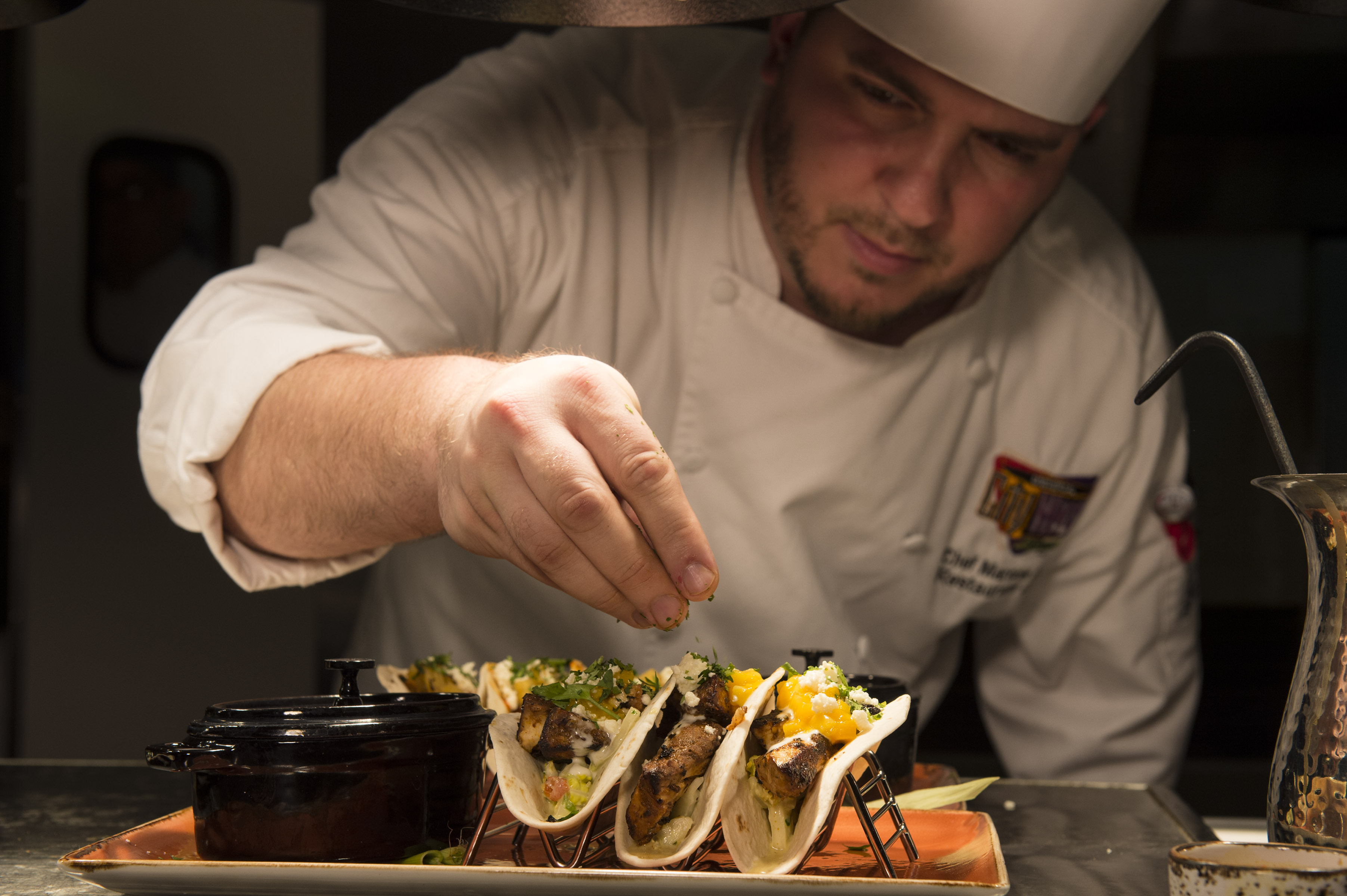 A chef garnishing fresh gourmet tacos on a platter at a Universal Orlando Resort restaurant.