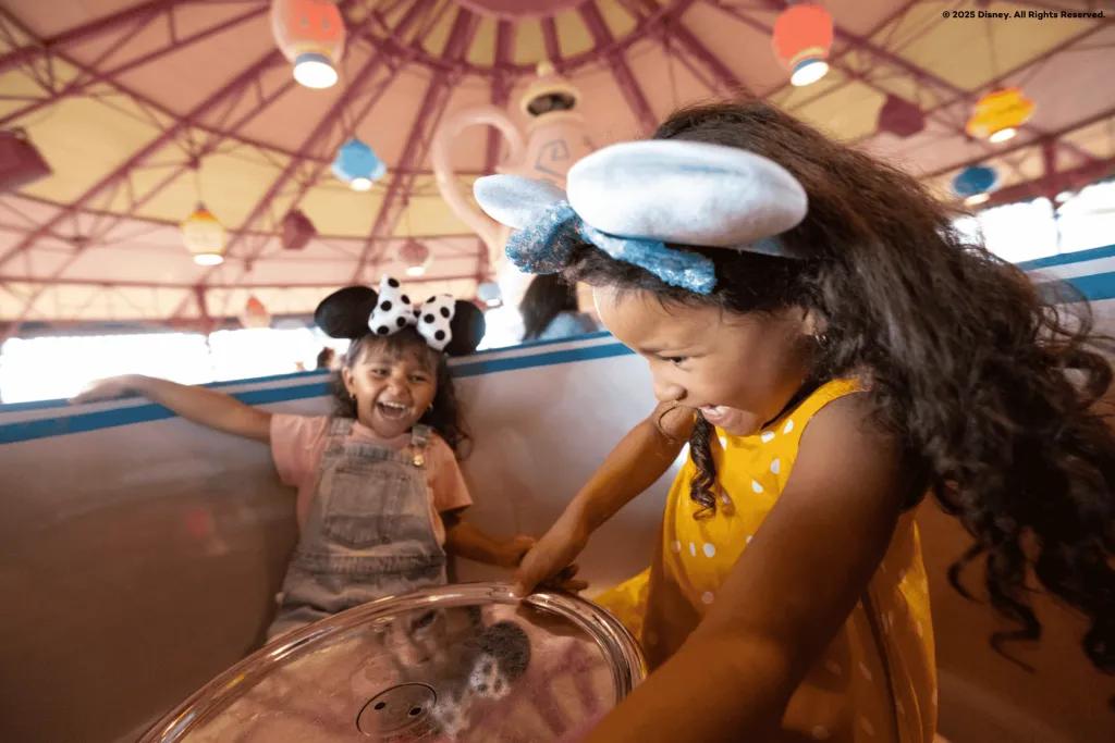Two young girls on a spinning teacup ride