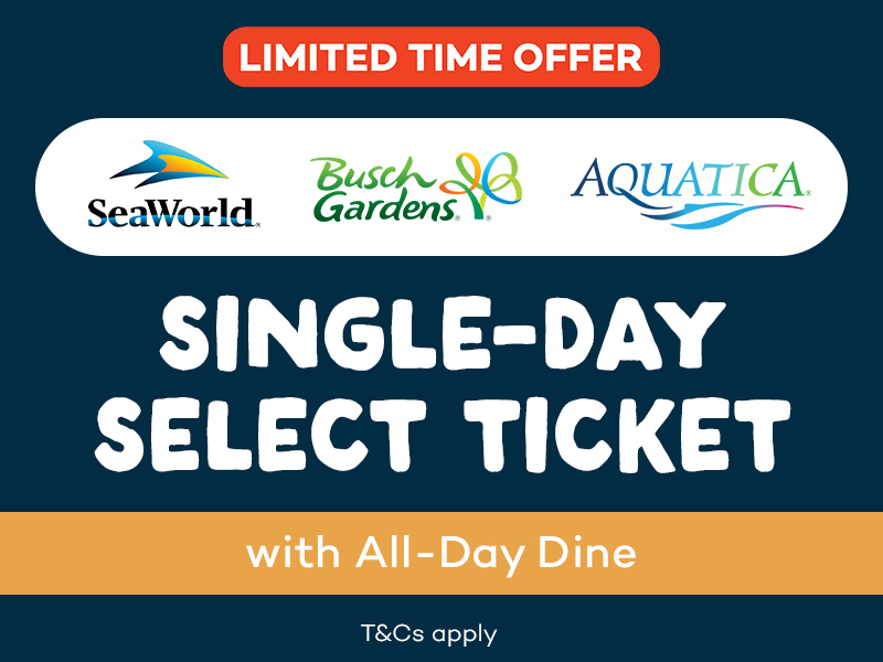 - A single visit to your choice of either SeaWorld Orlando, Aquatica or Busch Gardens Tampa Bay. No advance park selection is required; choose upon arrival.