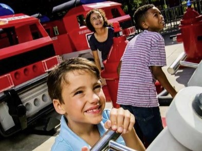 Fire Drill! Take control of your fire truck or police vehicle and race to put out the fire. Min height 34 inches.